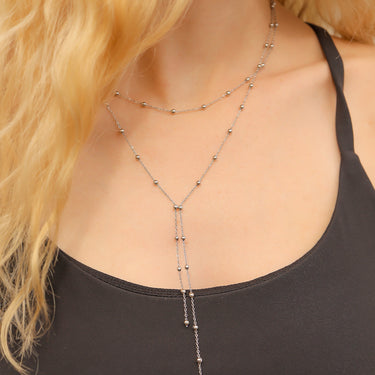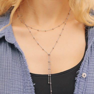 Elevate any outfit with this Lariat Necklace Double Satellite. The lariat style with double satellite chains add a contemporary flair, making it an eye-catching piece that appeals to a wide range of customers. Whether you wear this necklace by itself or layer it with other pieces for a more dynamic look, this necklace brings versatility and modern edge to any ensemble. A perfect balance of luxury and durability, this 18K Gold PVD stainless steel lariat necklace is made for those who value quality and style.
