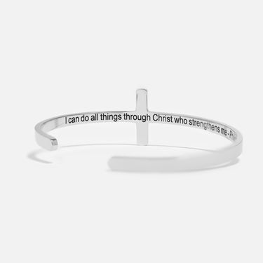 A simple, timeless design that is perfect for any season. Sweet, sentimental, and perfect for gift giving! The cross cuff bracelet is more than just a classic cuff. Featuring Philippians 4:13 engraved on the interior, the cross cuff bracelet is a sentimental treasure for those seeking a symbol of faith and motivation, whether as a personal piece or a meaningful gift.