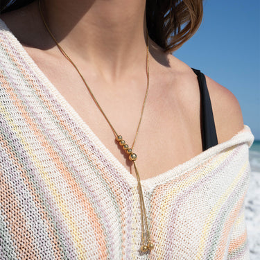 A simple look that offers endless style opportunities! The Adjustable Ball Charm Necklace is a stunning necklace for any season. Featuring a classic snake chain adorned with four sparking ball charms and an adjustable bolo style clasp, this necklace is as beautiful as it is versatile! Crafted from the highest quality 18K Gold PVD Stainless Steel, your customers can cherish this necklace for years to come!