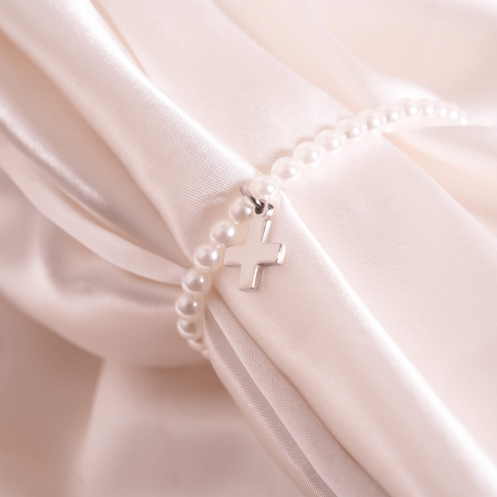 Elevate your everyday style with this elegant stretch bracelet, featuring luminous faux pearls and a dainty cross charm. Crafted from durable stainless steel with a radiant 18K gold PVD finish, this bracelet combines timeless grace with lasting wear. The stretch design ensures a comfortable, easy fit—perfect for stacking or wearing solo for a touch of faith and sophistication.