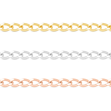 The Diamond Cut Curb Chain permanent jewelry chain features a lightweight and breathable look that can stand on its own, but is also often used for charm looks. Our Diamond Cut Curb Chain is 0.25 x 0.9 mm thick and is available in 14K Solid Gold, 14K Solid Rose Gold, and .925 Sterling Silver. This chain is sold by the foot.