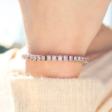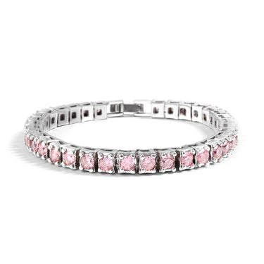 The Wholesale White 18K Gold PVD Coated Over Brass Pink CZ Fashion Bracelet jewelry is made with Brass and consists of copper and zinc. The Brass is dipped in pure 18k white gold, making it the perfect luxurious bracelet at an affordable price.