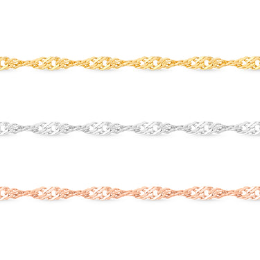 The Singapore Permanent Jewelry Chain is a twisted chain linking pattern that blends the look of a curb chain with that of a rope chain. This unique fine jewelry chain is 0.2 x 1.2 mm thick and is available in 14K Solid Gold, 14K Solid Rose Gold, and Solid Sterling Silver. This item is sold by the inch.