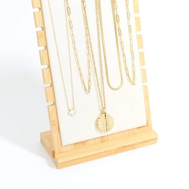 This unit holds up to 12 Necklaces and Chains depending on how you want to use the notches. This works great to display the "Layered chain" look.