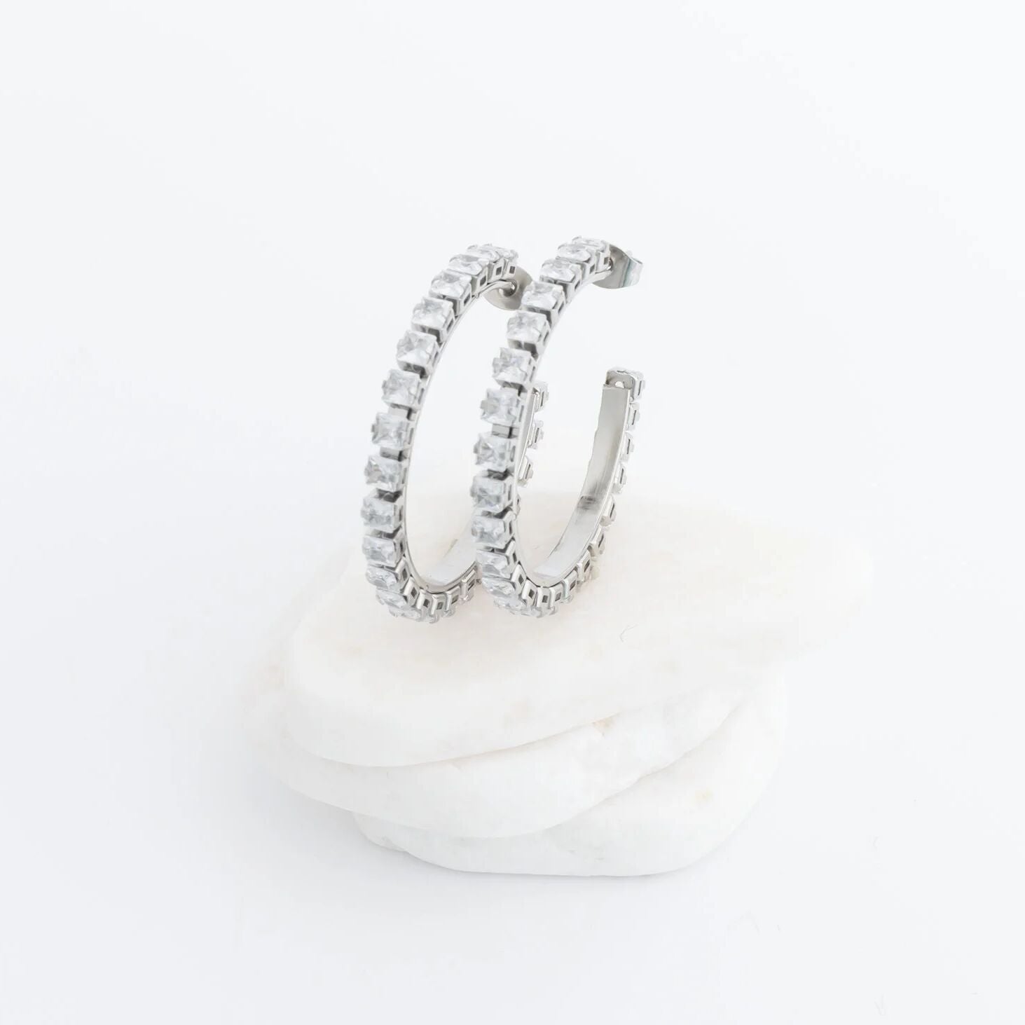 Elevate your style with luminous stone hoop earrings featuring 18K gold PVD coating on stainless steel. Ideal for office meetings or evening events, these versatile hoops deliver lasting shine and comfortable wear throughout the day.