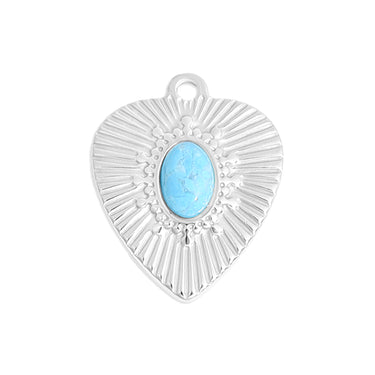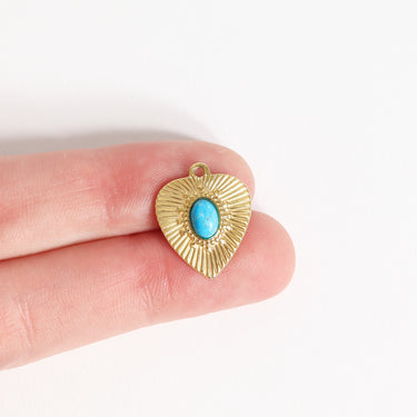 We have taken the Sunburst Heart Charm and elevated it to a stunning jewelry piece with the addition of a Semi Precious Turquoise or Howlite Stone. This charm will add a depth of texture and subtle natural color to your customer's bracelet or necklace. Stunning enough to be worn on its own as a single pendant or a beautiful addition to a multi charm bracelet or necklace. Your customer can choose from Stainless Steel or 18K Gold PVD Stainless Steel with either a Semi Precious Turquoise or Howlite stone.