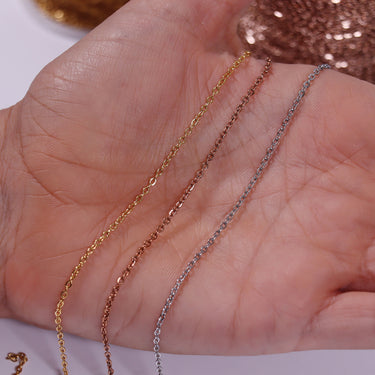 We use the process of PVD Coating our 18K Gold and 18K Rose Gold chains over 316L surgical grade stainless steel for a non-tarnish, hypoallergenic, polished finish that will hold up best to everyday wear and will never turn your customer's skin green.