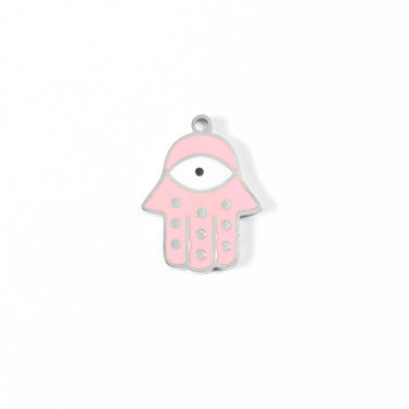 Give your chain necklaces and bracelets the perfect pop of color with our pink Hamsa Hand Evil Eye Charm! This stunning charm is more than just an accessory, its a symbol of happiness and positivity that you can add to a variety of chain types! Made with pink and white epoxy and our proprietary blend of 18K Gold PVD coated surgical-grade stainless steel designed for everyday wear, your customers have quality, style, and comfort all in a single charm.