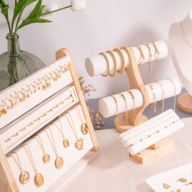 Showcase your jewelry with our stunning new natural wood and suede 2 tier jewelry display! Crafted from premium quality wood, this display combines modern design with natural beauty, making it the perfect choice for showcasing a variety of chain bracelets, necklaces, or chains. Available in white or black, you can display a variety of looks in an elegant way perfect for increasing your in-person sales!