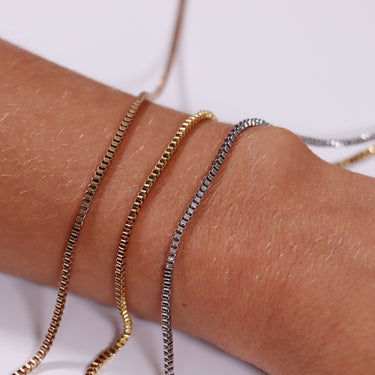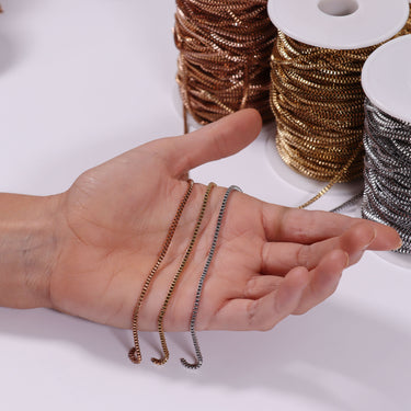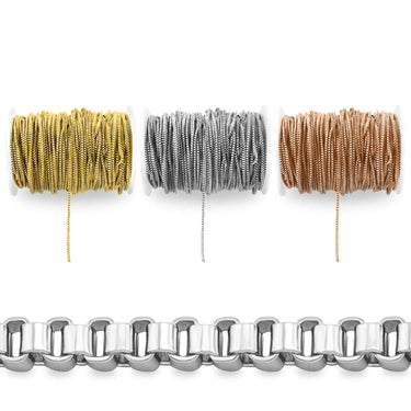 Having the ability to make your own jewelry with chains however long you need them is a great business practice. This 2mm Box Chain is a very popular chain style that is great for making bracelets and necklaces custom to your business needs. The 2mm Box chain is made with surgical grade, hypoallergenic, non-tarnish stainless steel and is a great alternative to fine jewelry when creating more economical permanent jewelry. It is also great for your bottom line!