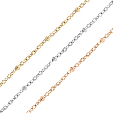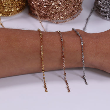 Having the ability to make your own jewelry with chains however long you need them is a great business practice. This 2.5mm Beaded Satellite Chain is a very popular chain style that is great for making bracelets and necklaces custom to your business needs. The 2.5mm Beaded Satellite Chain is made with surgical grade, hypoallergenic, non-tarnish stainless steel and is a great alternative to fine jewelry when creating more economical permanent jewelry. It is also great for your bottom line!