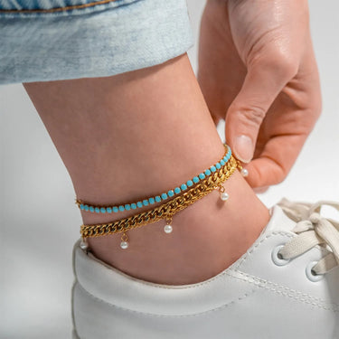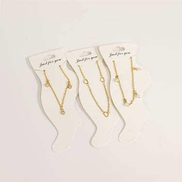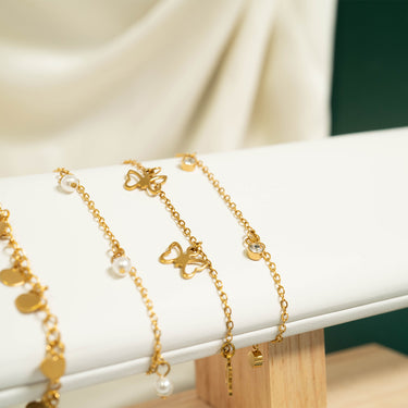 Embrace timeless elegance with this 18K Gold PVD Stainless Steel Pearl Anklet." Features luminous pearls delicately arranged along the chain, exuding sophistication and classic charm. <>Perfect for weddings, special occasions, or everyday wear, this anklet complements any outfit with effortless grace.