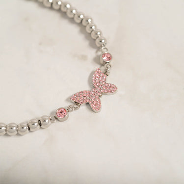 18K Gold PVD Stainless Steel Butterfly Stretch Bracelet, adorned with delicate pink stones. A harmonious blend of elegance and charm, this piece offers timeless beauty with a modern twist—perfect for effortless sophistication
