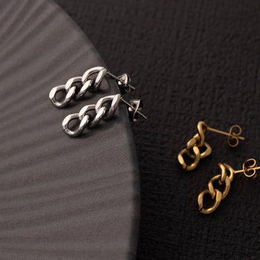 Clean lines with fluid movement. A polished stud drops into a slim curb‑chain dangle in 18K Gold PVD over stainless steel, catching light with every step. Water‑resistant, tarnish‑resistant, and lightweight for all‑day wear. Style solo for minimal shine or stack with hoops and cuffs for a layered look.