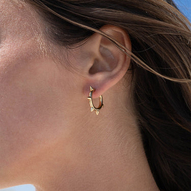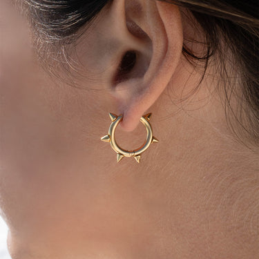 The Spike hoop earrings add a sharp touch to any outfit. Crafted from high quality 18K Gold PVD as well as stainless steel, these hoop earrings feature unique spikes perfectly decorating your ears. These edgy earrings are sure to make a statement in any store or personal collection.