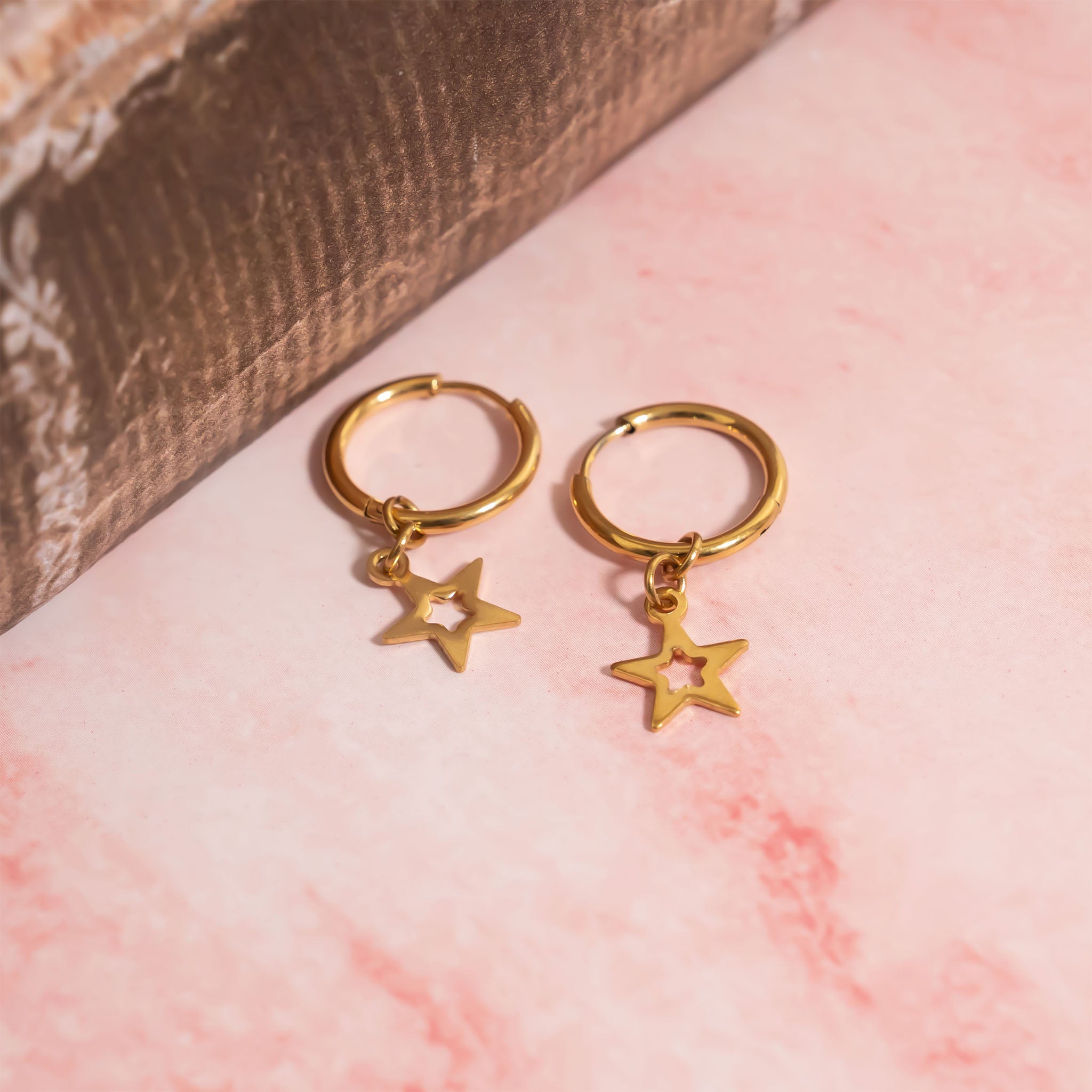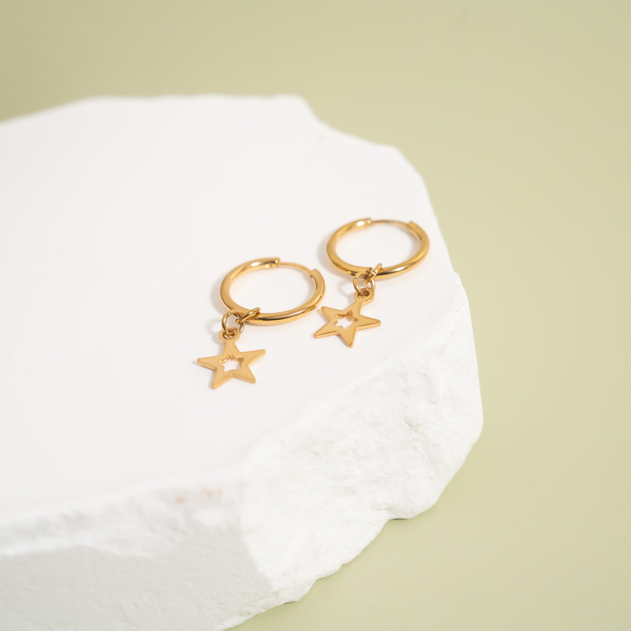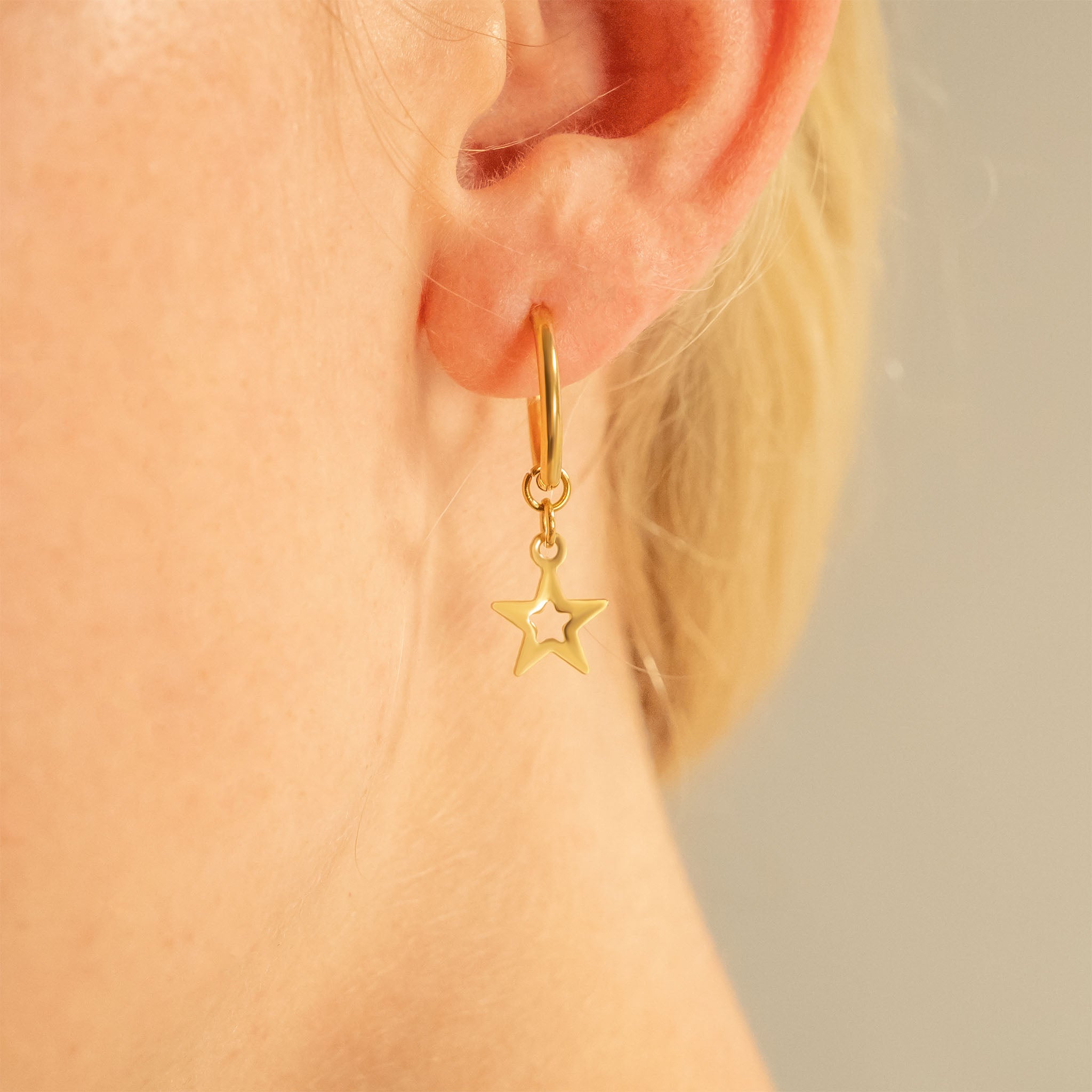 The Star Pendant Hoop Earrings are great as a stand-alone seller but are the perfect option to be paired with other or stud earrings for a stacked look. Explore our complete Earring Collection to start building your own assortment of stacked earring looks!