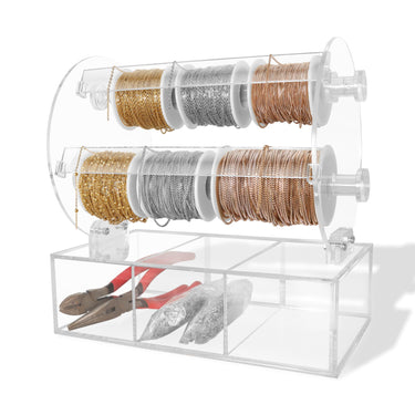 We have created this perfect chain spool holder with our clients in mind. We wanted to make something sleek, classy and practical to hold all of your chain spools. We made it out of sturdy clear acrylic to highlight the chains rather than the holder. We added a little drawer in the bottom to keep your findings, connectors and tools all in one handy, organized space. This unit packs up quick if you're working as a mobile vendor and doesn't take up a lot of room if you want in out on your display counter . This will easily hold 6-8 spools depending on their size. It's a great way to show off your different chain styles to sell chains by the inch. Just pull out the desired length, cut and assemble. Its so easy, organized and looks great!