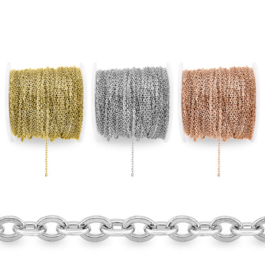 Enhance your jewelry creations with our Stainless Steel 2mm Oval Loop Chain, available in a generous 164' spool (50 meters). This elegant chain features oval-shaped links that provide a refined and modern look, perfect for a wide range of jewelry applications. The 2mm width strikes a perfect balance between delicate sophistication and robust durability, making it ideal for crafting stylish necklaces, bracelets, and custom designs. Having the ability to make your own chains however long you need them is a great business practice. It is also great for your bottom line!