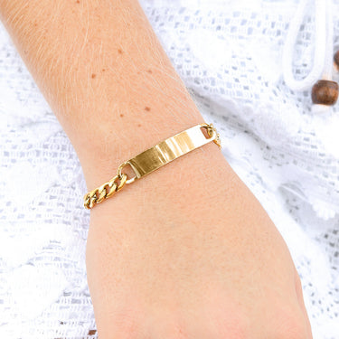 Check out the 18K Gold PVD Stainless Steel Blank ID Curved Bar Bracelet! This dazzling bracelet features an elegant, curved blank ID bar that can be engraved with your initials or a special message. It's the perfect way to add a personal touch to your daily style and with its simple construction you can easily wear this piece with your everyday look no matter what fashion sense you have. So whether you treat yourself or gift to a friend, this bracelet is a stunning classic you can cherish for years to come!