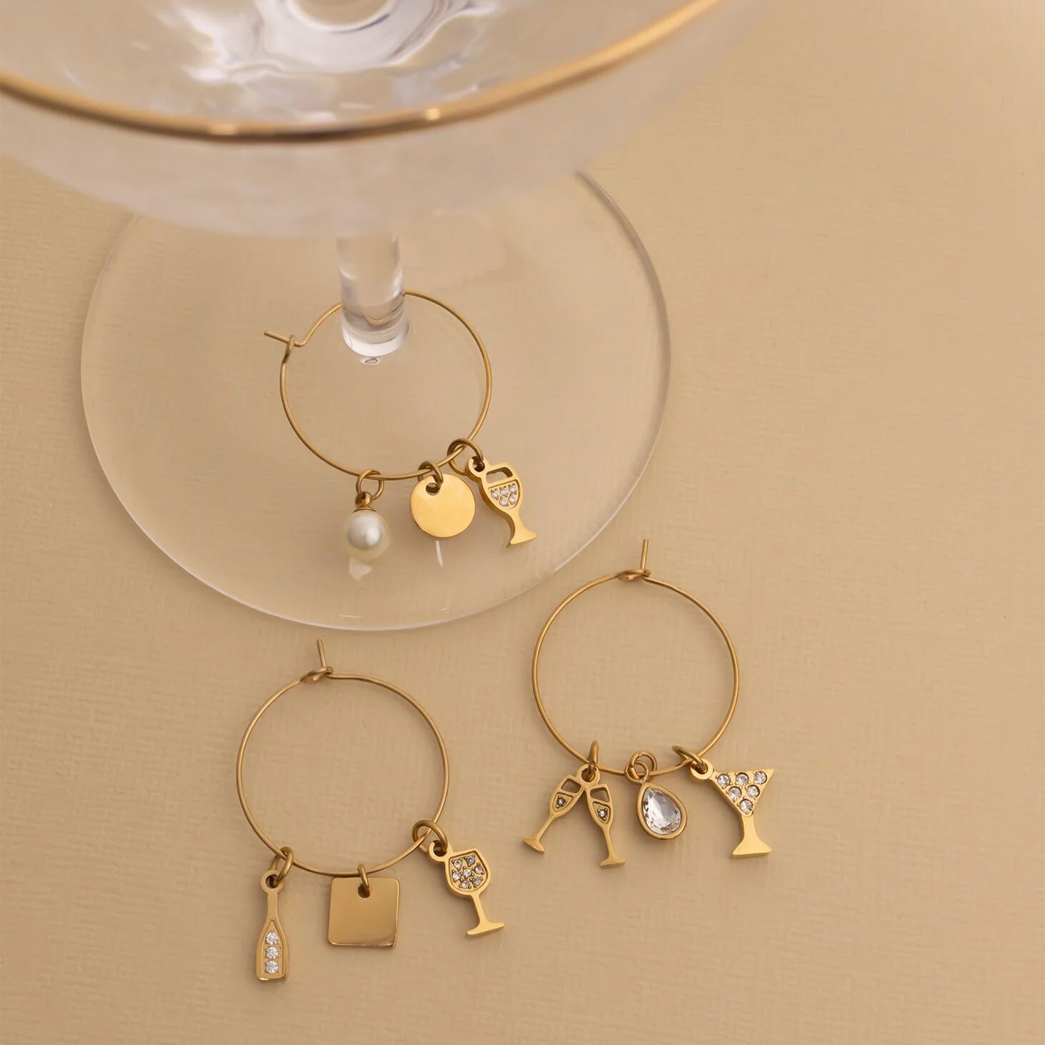 Entertain with intention using the 18K Gold PVD Stainless Steel Wine Charm Collection, a coordinated assortment designed to elevate every table setting. Crafted from premium stainless steel and finished in radiant 18K Gold PVD, each charm delivers long-lasting, tarnish-resistant shine built to withstand celebrations, dinner parties, and special occasions. Featuring a curated variety of distinctive motifs, this collection allows guests to easily identify their glasses while adding a refined decorative accent to entertaining spaces. Lightweight, hypoallergenic, and thoughtfully packaged, it offers both functional elegance and boutique-ready presentation.