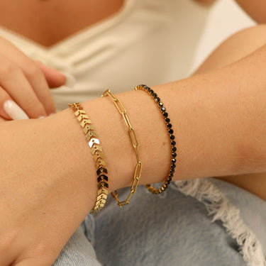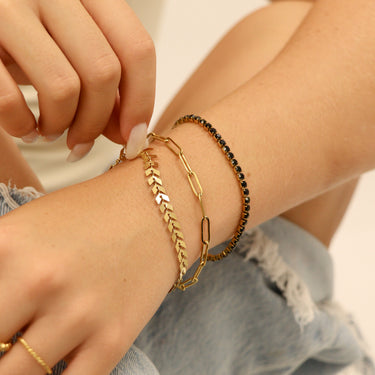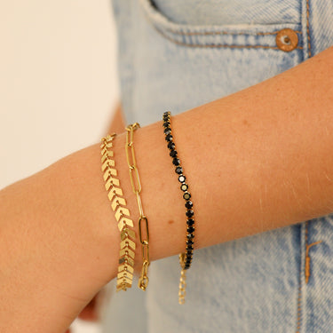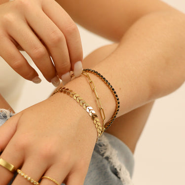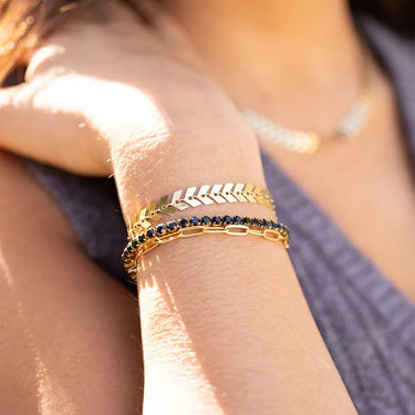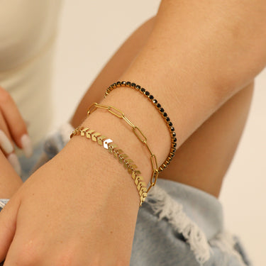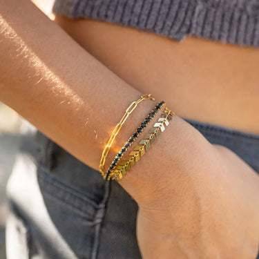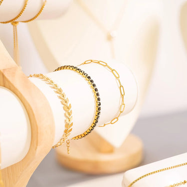 This curated set of bracelets includes 3 best-selling styles of our 18K Gold PVD coated stainless steel bracelets in a variety of sizes perfect for showing your customers how to create their own layered look. In this set, you'll get a total of 25 bracelets (5 of each size in all 3 styles).