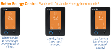You can change the energy in half-jewel increments, a highly valuable feature when working with different types of chain. Half-joule increments allow you to fine tune your energy to produce the perfect weld. For example, when 4 joules is too much energy, but 3 joules is not enough energy, being able to set the energy level at 3.5 joules will deliver just the right amount of energy for beautiful results.