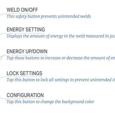 This permanent jewelry welder comes with two safety features to prevent accidental energy discharge. The Weld On/Weld Off button is your primary safety feature; you cannot weld when the button is off. The Lock button will allow you to weld but won’t allow energy changes to be made while the button is the lock mode.