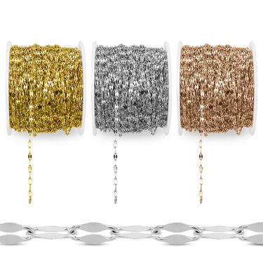 Elevate your jewelry designs with our Stainless Steel PVD Coated 2mm Lip Chain, available in an impressive 164' spool (50 meters). This sleek chain features a distinctive lip link design with a PVD coating that enhances both its appearance and durability. The 2mm links provide a modern, polished look while the PVD coating ensures a vibrant finish that resists tarnish and wear. Ideal for crafting high-end necklaces, bracelets, and unique custom designs, this chain combines strength with sophistication. Having the ability to make your own chains however long you need them is a great business practice. It is also great for your bottom line!