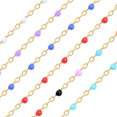 Offer your customers the perfect pop of color with the Beaded Link Chain! Whether you're looking for a popular chain for your own line of necklaces or bracelets, creating a charm bar, or adding it to your permanent jewelry business, this is a versatile chain to keep on hand. Available in 5 colored bead options; white, lavender, royal blue, confetti, red, and turquoise.