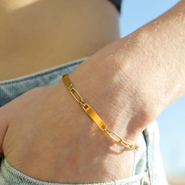 18K Gold Stainless Steel Engravable Paperclip Bar Bracelets are strong, durable, and don't easily break.