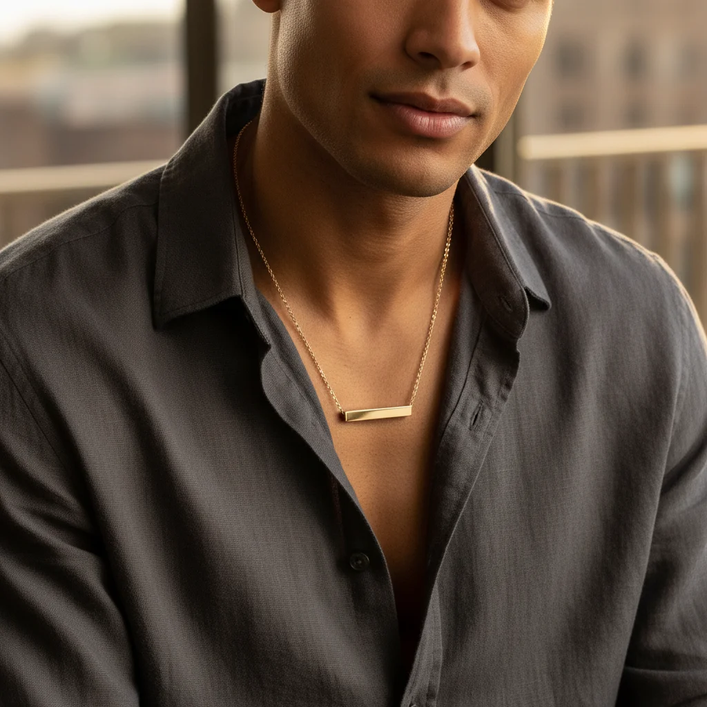 The Wholesale 18K Gold PVD Stainless Steel Large Square 4-Sided Horizontal Polished Bar Necklace is made with a proprietary blend of 316L Surgical Steel.