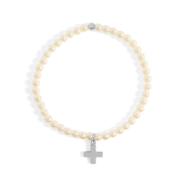 Elevate your everyday style with this elegant stretch bracelet, featuring luminous faux pearls and a dainty cross charm. Crafted from durable stainless steel with a radiant 18K gold PVD finish, this bracelet combines timeless grace with lasting wear. The stretch design ensures a comfortable, easy fit—perfect for stacking or wearing solo for a touch of faith and sophistication.