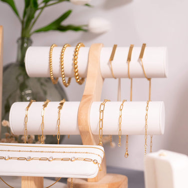 새롭게 선보이는 아름다운 천연 원목과 인조 가죽으로 제작된 1단 팔찌 디스플레이로 주얼리를 돋보이게 하세요! 최고급 원목으로 제작된 이 디스플레이는 모던한 디자인과 자연의 아름다움이 어우러져 다양한 팔찌를 전시하기에 완벽한 선택입니다. 화이트와 블랙 색상으로 출시되어 다양한 스타일을 우아하게 연출할 수 있으며, 매장 판매를 늘리는 데에도 안성맞춤입니다!