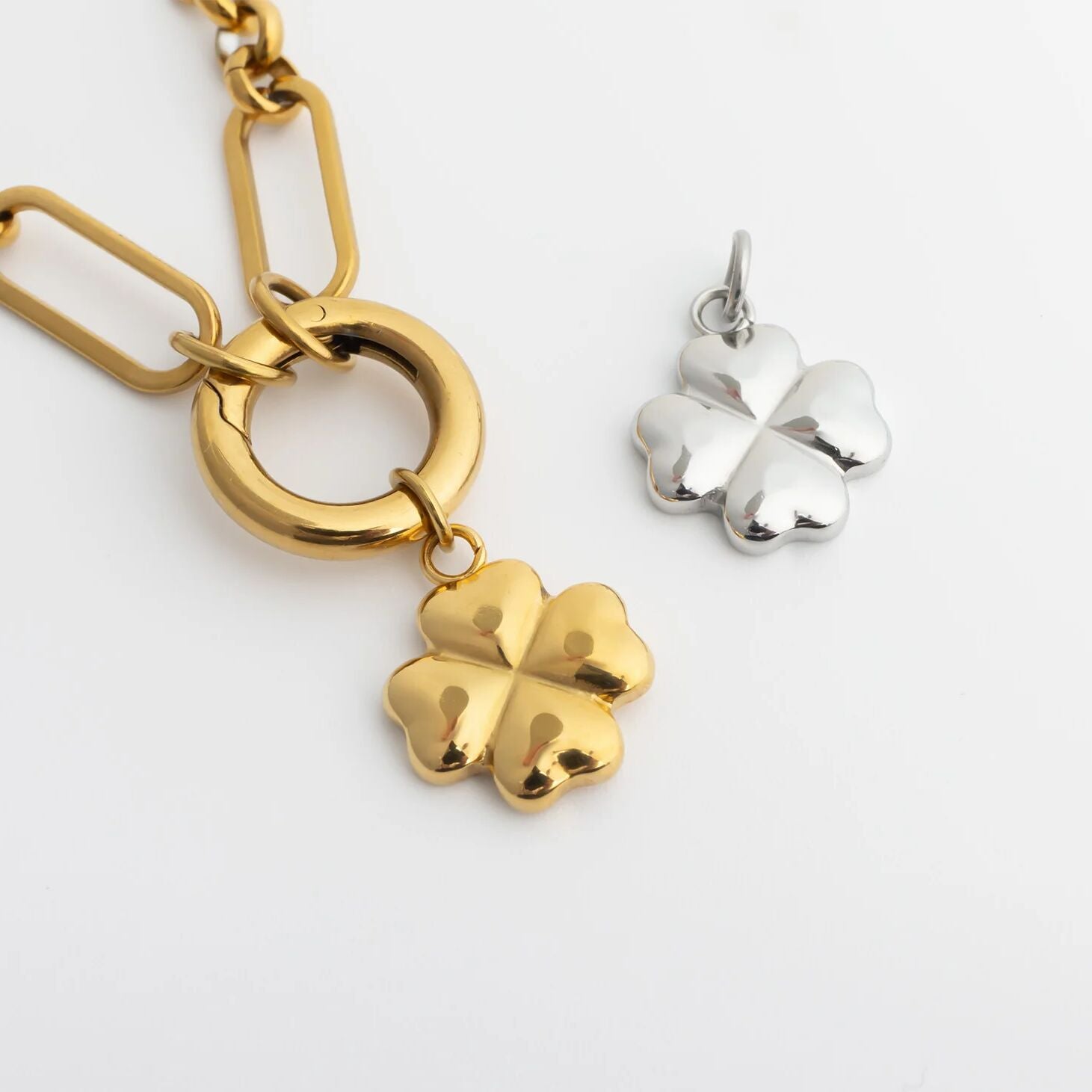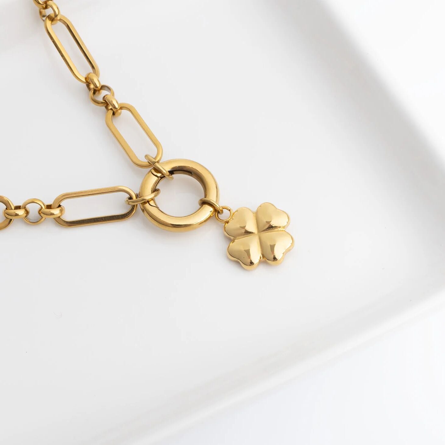 A timeless symbol of luck and positivity, the 18K Gold PVD Stainless Steel Four Leaf Clover Charm brings meaningful elegance to any charm collection. Crafted from premium stainless steel and finished in radiant 18K gold PVD, this charm delivers long-lasting, tarnish-resistant shine designed for everyday wear. The classic four leaf clover motif represents good fortune and hope, offering a subtle yet eye-catching accent for bracelets, necklaces, or charm holders. Lightweight, hypoallergenic, and thoughtfully designed, this piece blends symbolism with dependable craftsmanship.