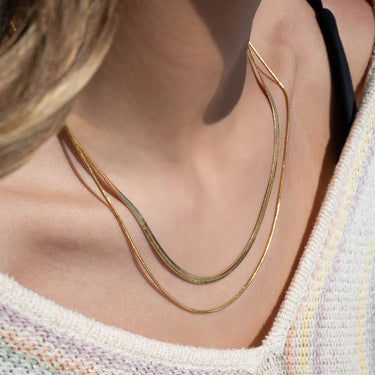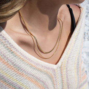 This new layered herringbone and snake chain necklace is a classic accessory that adds to any outfit or ensemble. crafted from high-quality stainless steel as well as 18K Gold PVD these necklaces will never fade, tarnish, or turn your customer's skin green. This necklace is a staple in any storefront or personal collection. grab your while they last!
