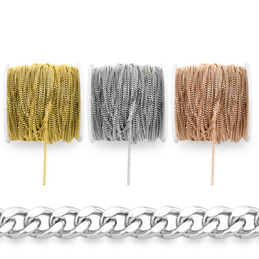 Illuminate your jewelry designs with our Stainless Steel 2mm Diamond Cut Curb Chain, available in an extensive 164' spool (50 meters). This stunning chain features diamond-cut links that create a dazzling, reflective surface, adding an extra layer of brilliance to any piece. The 2mm curb links offer a sleek, modern aesthetic while maintaining exceptional strength and durability. Perfect for crafting sophisticated necklaces, bracelets, and custom designs, this chain is ideal for both everyday elegance and special occasions. Having the ability to make your own chains however long you need them is a great business practice. It is also great for your bottom line!