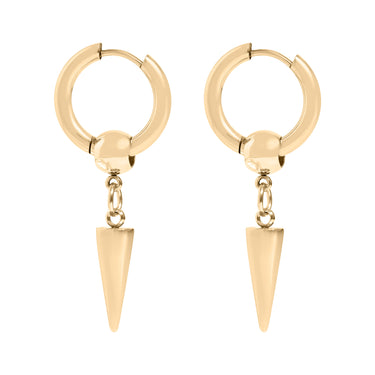 Crafted from high-quality 18K Gold PVD as well as stainless steel, our earrings are perfect for everyday wear and tear! The Spike Pendant hoop earrings feature a metal spike that dangles from the ear lobe perfectly adorning it for a gothic look. These edgy earrings are sure to make a point in any store or personal collection.