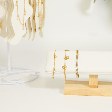 Radiate elegance with this 18K Gold PVD Stainless Steel Stone Anklet. Features a delicate arrangement of shimmering stones, adding a subtle yet captivating sparkle to your every step. Perfect for enhancing casual looks, special occasions, or gifting to someone who loves timeless accessories.