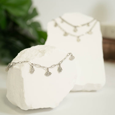 A delicate paperclip chain charm bracelet featuring Hamsa and Evil Eye charms dusted with small clear crystal stones. This 6.5" bracelet features a 1" extender and a lobster closure for easy wear and sizing. Beautiful on its own or worn with a personally crafted bracelet stack. Perfect for gift giving.