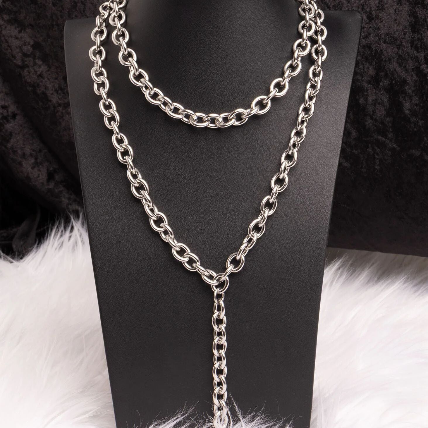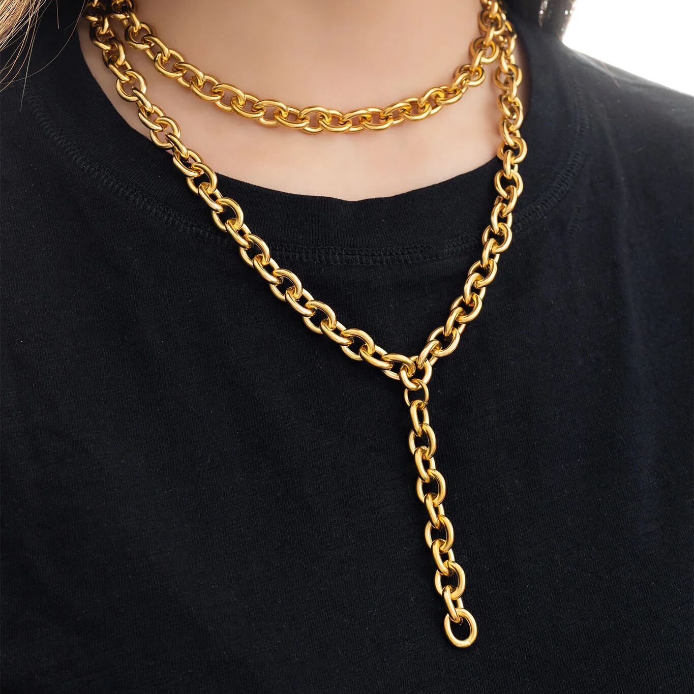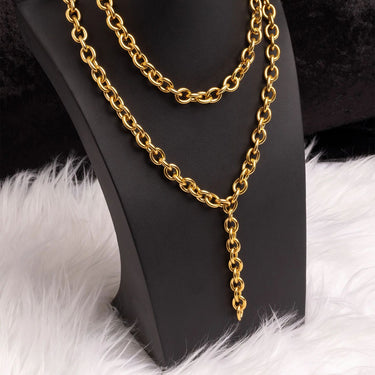 Command attention with our 18K Gold PVD Stainless Steel Chunky Chain Lariat Necklace — a bold fusion of strength, versatility, and shine. Crafted from premium stainless steel and finished in radiant 18K gold PVD, it offers lasting brilliance, water resistance, and protection against tarnish. The adjustable lariat design transitions effortlessly from a close choker to an elongated drop, giving you endless styling options. With its substantial links and hypoallergenic comfort, this piece delivers modern luxury that’s built to be worn every day.