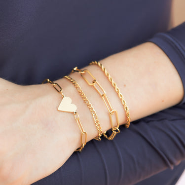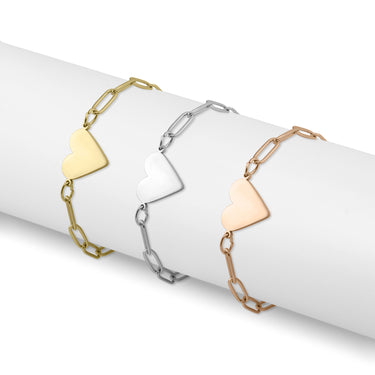 The Wholesale 18K Gold PVD Coated Stainless Steel Paperclip Heart Bracelet is made with a proprietary blend of 316L Surgical Steel.
