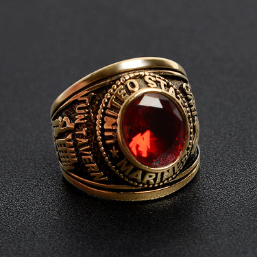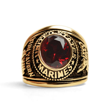 The 18K Gold PVD Stainless Steel Red Stone United States Marines Ring is strong, durable, and doesn't easily break.