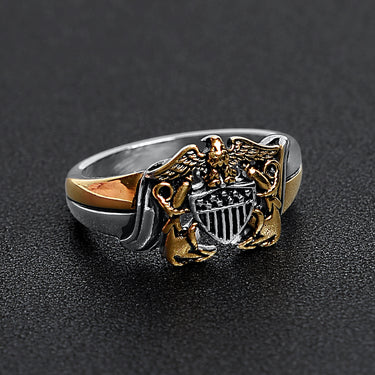 Show your patriotism and support for the United States Navy with this stunning two-tone stainless steel ring! Featuring the official United States Navy emblem at its center with a two tone stainless steel band, this ring is a beautiful way to show your pride in a sophisticated manner. Great for everyday wear and the delicate band makes it easier to pair with your everyday style or accent your formal attire for a special event. Treat yourself or treat another to this true representation of American spirit!