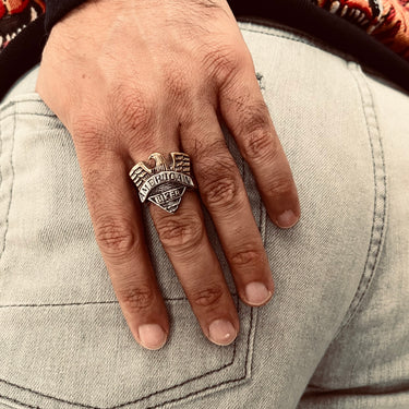 Introducing the Stainless Steel "AMERICAN BIKER" With 18K Gold PVD Coated Eagle Ring. The stainless steel band has a bold design and is adorned with an 18K gold PVD Coated eagle top piece, making this ring a truly unique American spirit statement piece. Perfect to wear for any occasion or gifting to a biker friend.