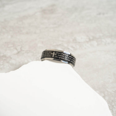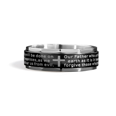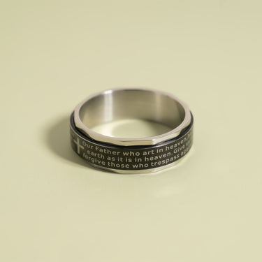 The Lord's Prayer Spinner Center Ring is a stunning and unique ring features the Lord's Prayer etched around a black spinner center. Perfect for those looking for a stylish way to express their faith or those seeking a subtle way to relieve anxiety or stress. Whether you accent your everyday look or pair with your Sunday best, this ring is sure to get noticed on any occasion!