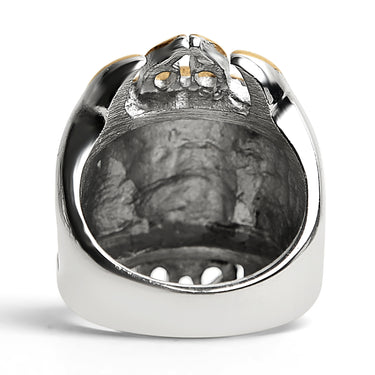 Stainless Steel Red CZ Eyed Flaming Skull With 18K Gold PVD Coated Accents Ring / SCR0250