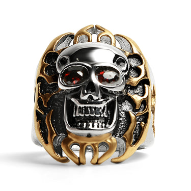The Wholesale Stainless Steel Red CZ Eyed Flaming Skull With 18K Gold PVD Coated Accents Ring is made of 18K gold and with a proprietary blend of 316L Surgical Steel.