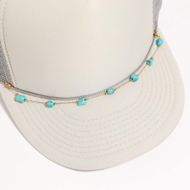 Looking for a fun way to dazzle up your trucker hat, look no further! The Turquoise Colored Stone Trucker Hat Chain effortlessly elevates your customers' favorite hats. Designed to fit seamlessly onto standard trucker hats, its features double-ended lobster clasps for easy attachment to the hat's mesh backing-simply snap and go!