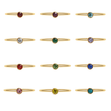 Skapa den perfekta färdiga att sälja Birthstone Stacking Ring-displayen med vår 18K guld PVD-belagda rostfria Birthstone Stacking Ring Set & Ring Display! Denna kurerade uppsättning av 18K guld PVD-belagda födelsestensringar i rostfritt stål inkluderar var och en av 12-månaders födelsestenarna i storlekarna 5-9 med extra backstock i de mest populära färg- och storlekskombinationerna.