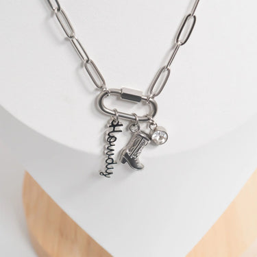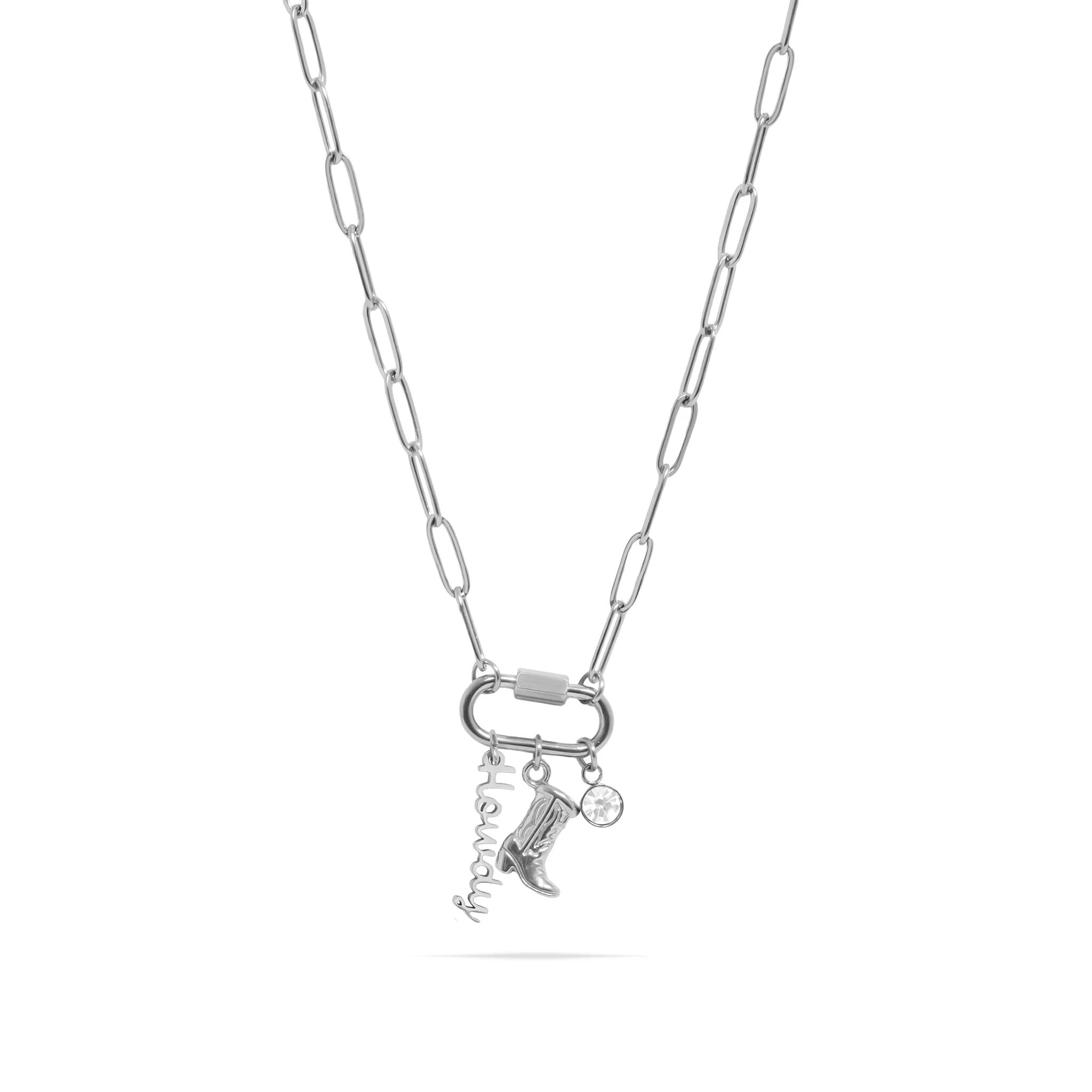 Make a bold statement with this 18K gold finish PVD-coated western carabiner necklace that blends rugged charm and everyday elegance.. Ready for workday polish or weekend adventures, this piece effortlessly elevates denim jackets and tailored blazers alike. Add to cart today to bring rugged elegance to your everyday look. Western-inspired carabiner clasp: easy to attach with authentic cowboy-inspired flair.